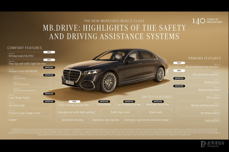 安全配置上,新车配备15个安全气囊、2个侧碰保护气囊及2个安全带气囊,PRE-SAFE® 预防性安全系统可在侧碰风险发生前将乘员推向非撞击侧,配合车身底盘主动抬升功能抵御冲击;后排正向安全气囊与安全带气囊可在碰撞时扩大接触面积,降低乘员受伤风险。
